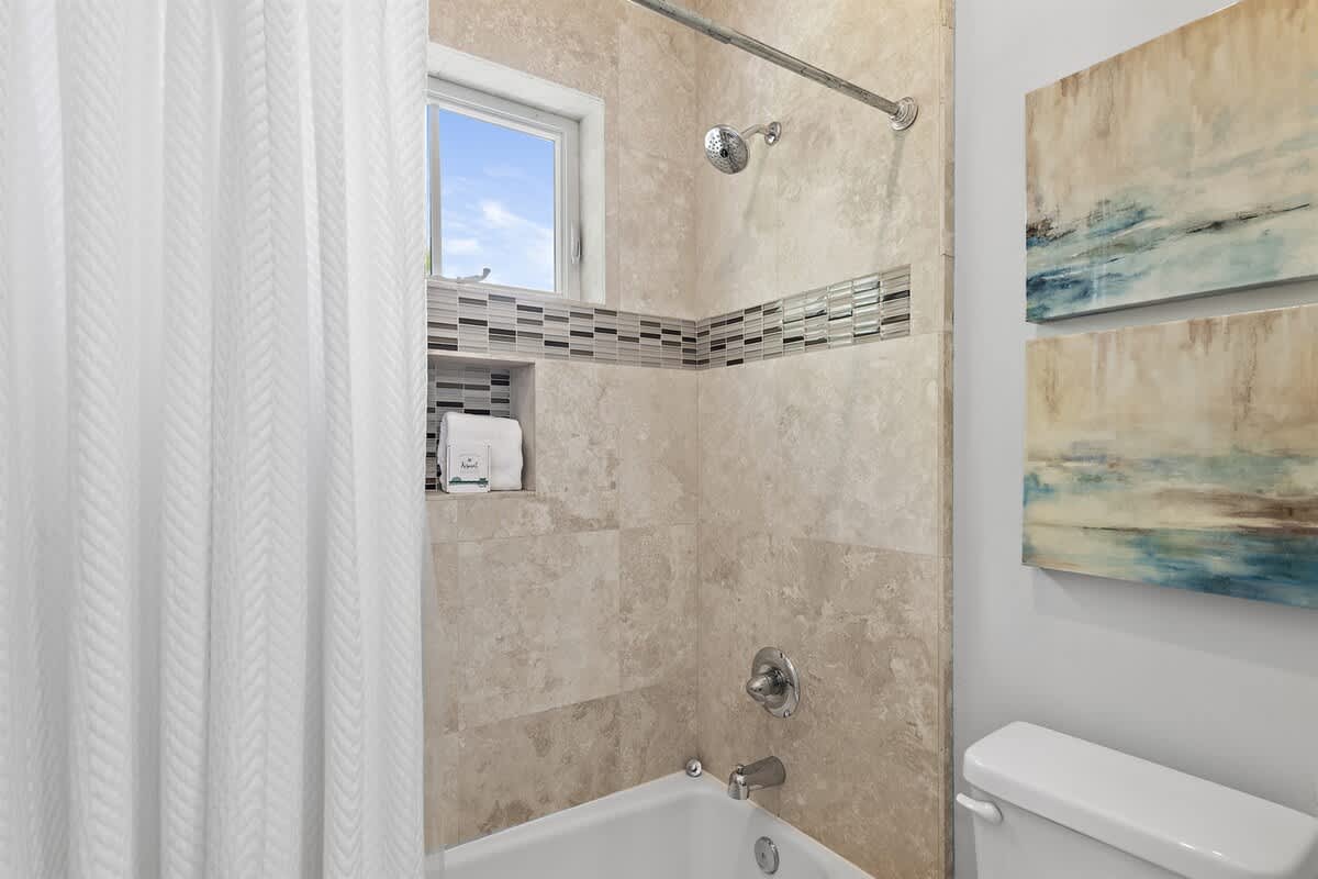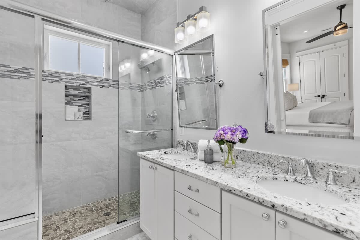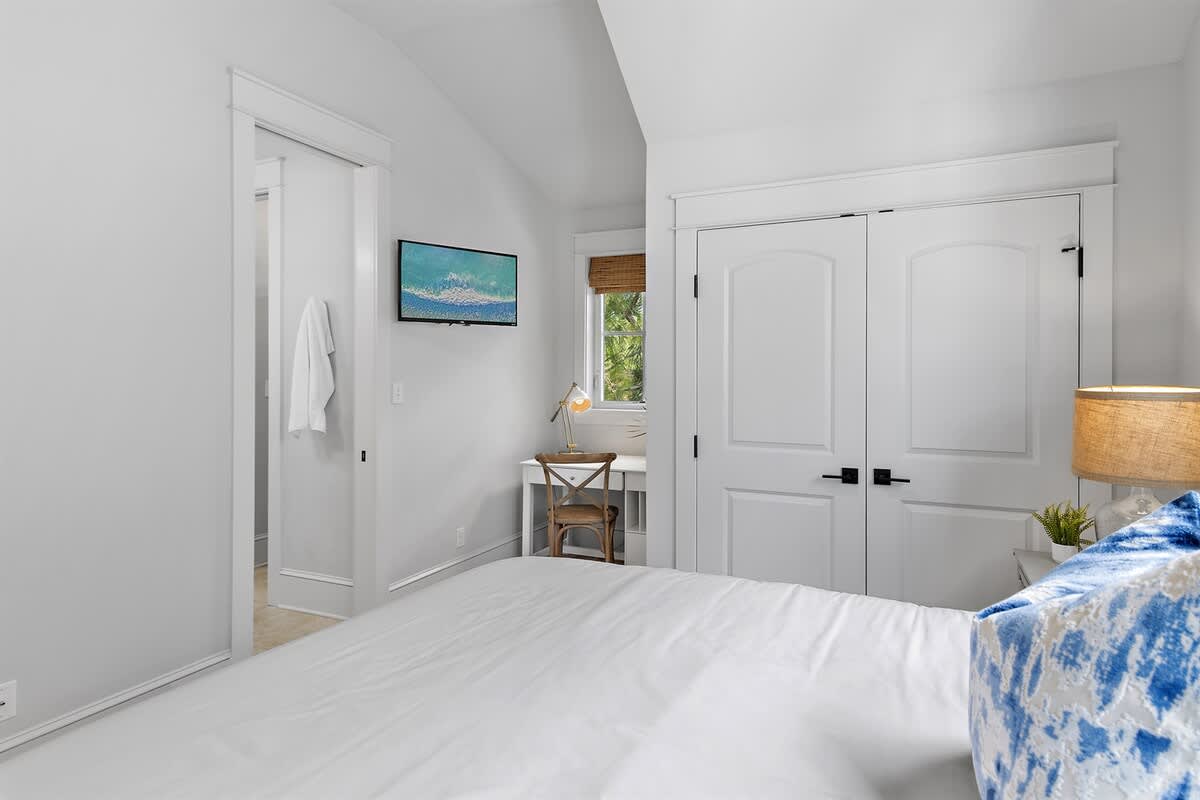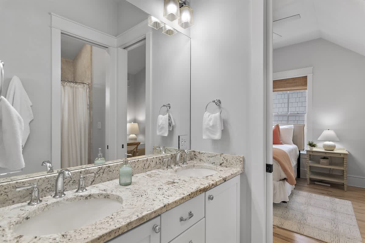 Designed with both privacy and togetherness in mind, the cottage offers four bedrooms to accommodate up to eight guests. On the first floor, two king bedrooms provide restful retreats, one of which includes its own private bath. Upstairs, two queen bedrooms share a convenient Jack and Jill bathroom, making it simple for families or friends to settle in comfortably. With air conditioning throughout, you’ll enjoy cool and restful nights after sun-filled days.
