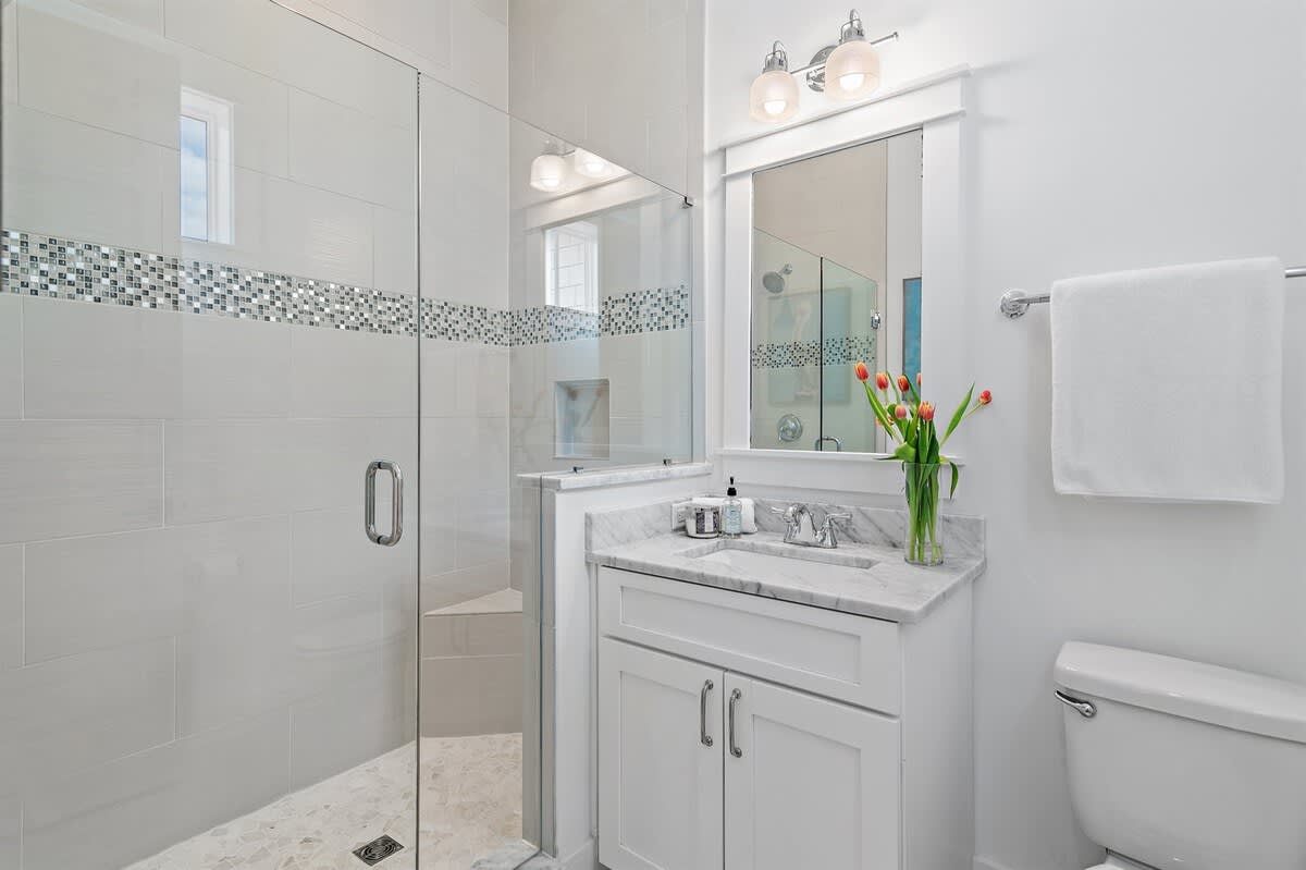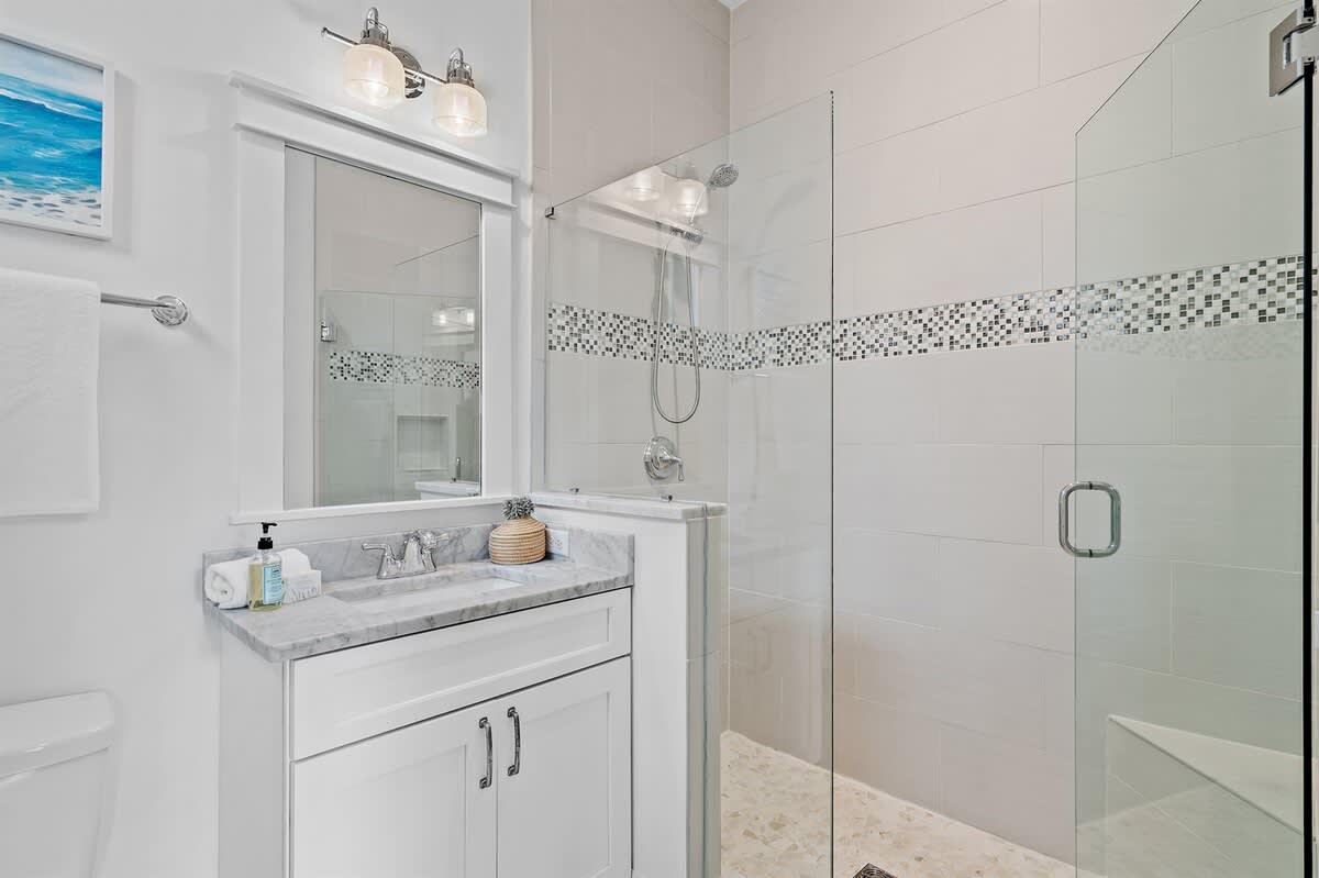 With space for up to 12 guests, this home offers four bedrooms, each with its own private bathroom for comfort and privacy. On the first floor, a king bedroom provides convenience with an ensuite featuring a walk-in shower. Upstairs, the primary suite includes a king bed and a spa-inspired bath with both a soaking tub and a shower. A queen bedroom with its own ensuite sits nearby, while the fourth bedroom features two full-over-full bunk beds and an ensuite bath with a shower, ideal for kids or groups. A half bath on the main floor adds extra convenience.