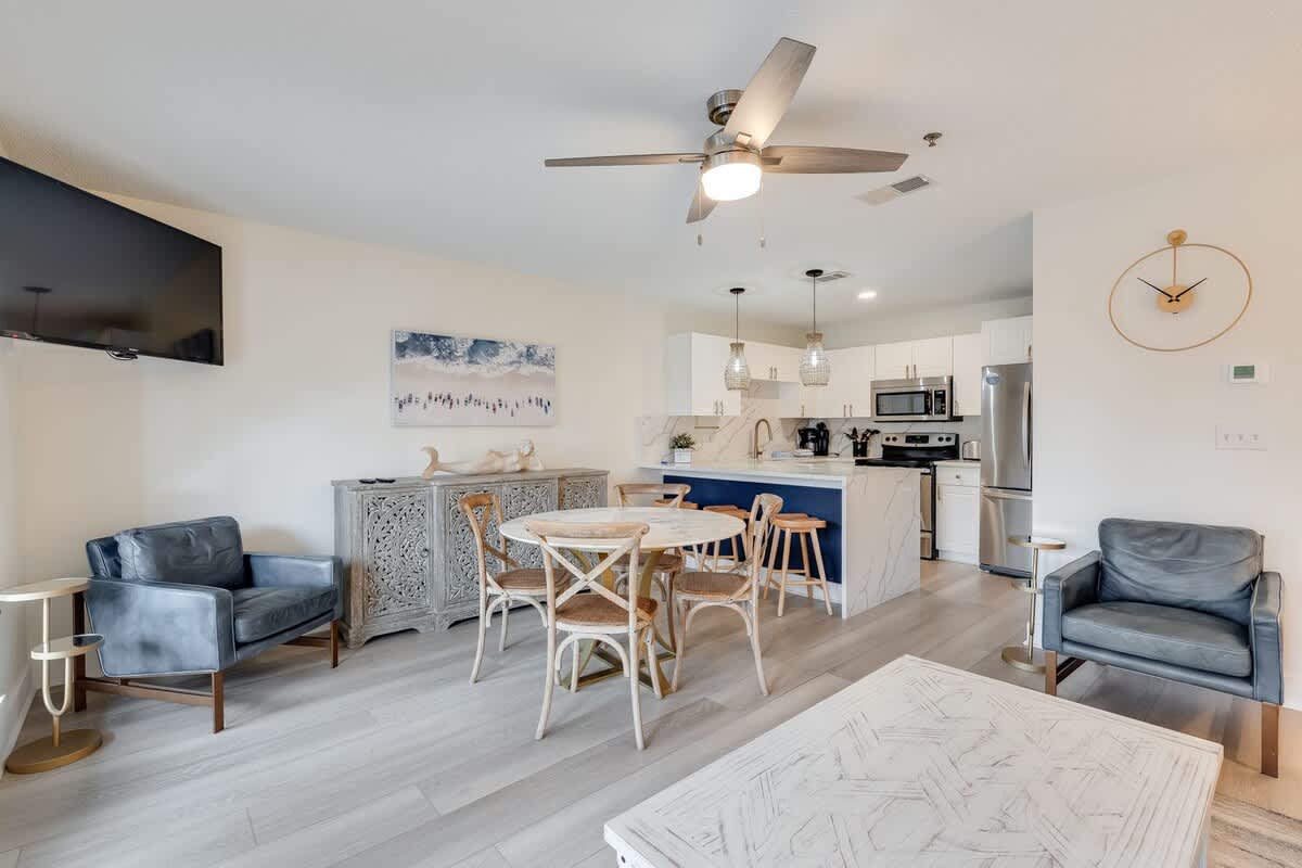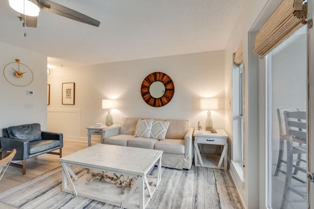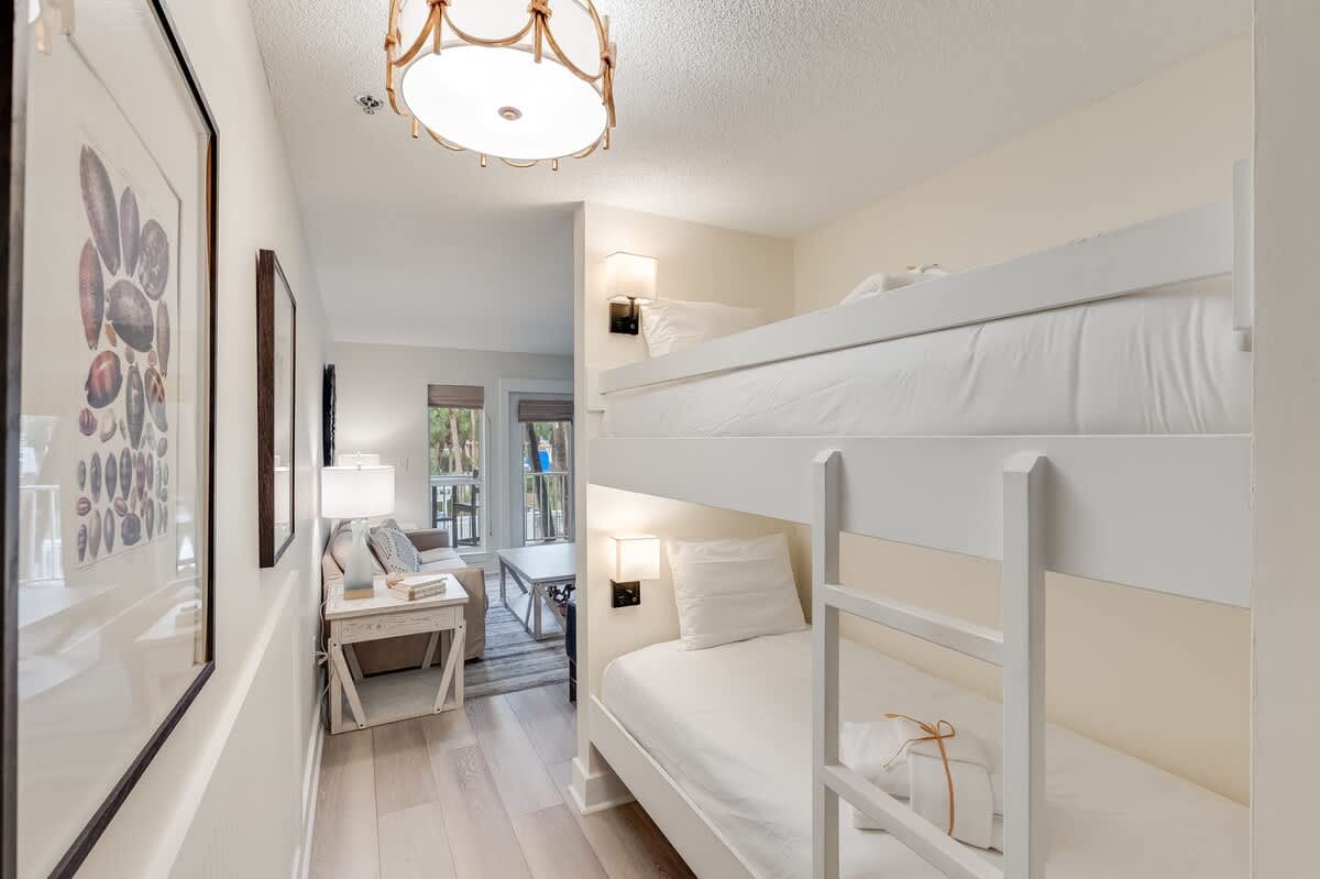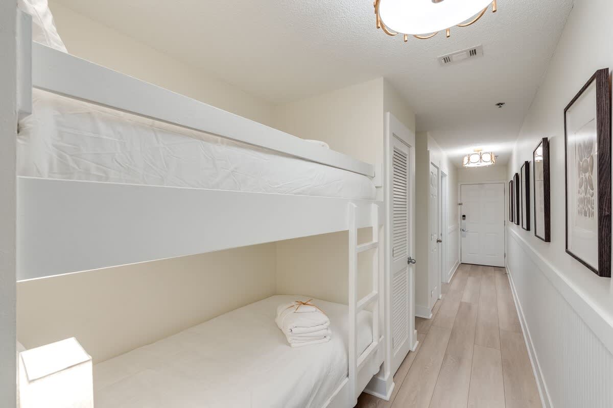 The condo is designed to comfortably host up to six guests, with a king bed in the primary suite and custom-built bunk beds that make it easy to accommodate families or groups traveling together. The setup provides a restful space for recharging after long days at the beach or exploring the local area.