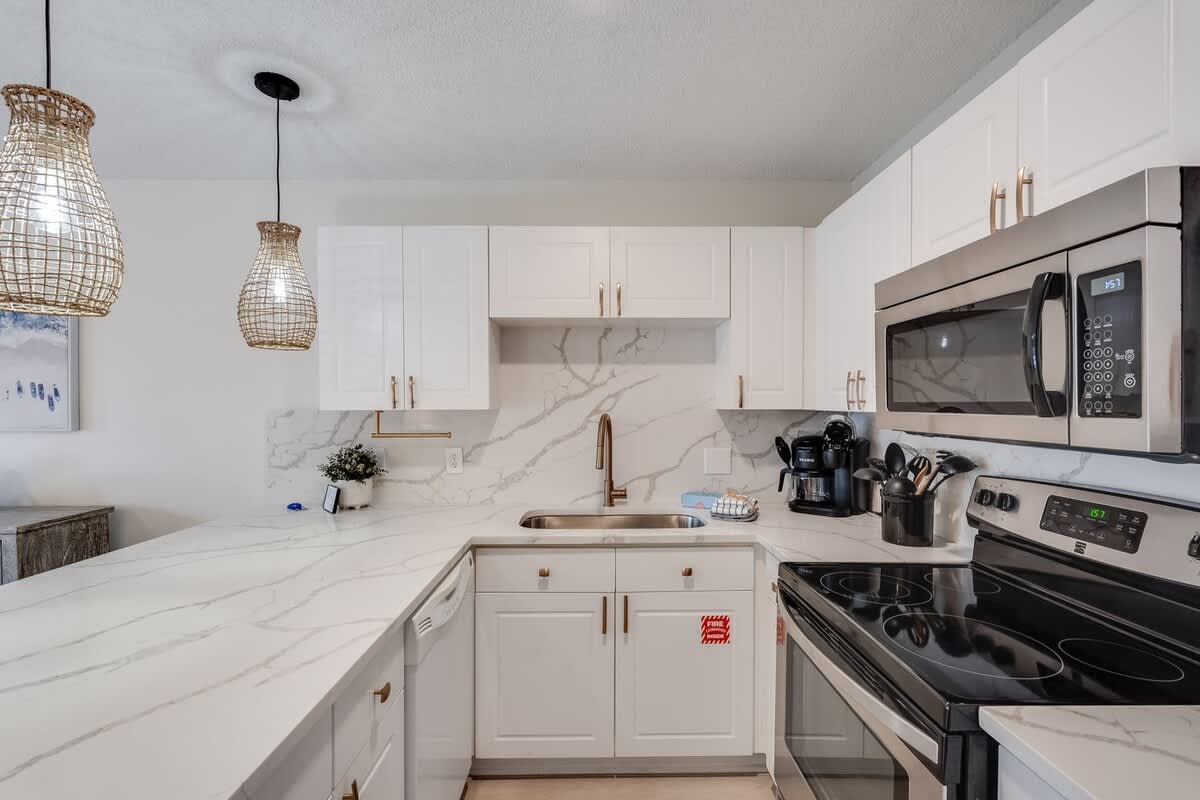 Inside, an open-concept living area welcomes you with natural light and comfortable furnishings. The upgraded kitchen is fully equipped for preparing meals, whether you’re cooking a casual breakfast or enjoying dinner together at the end of the day. A flat screen TV and high-speed Wi-Fi provide easy entertainment, while a dedicated workspace allows you to balance relaxation with remote work if needed.