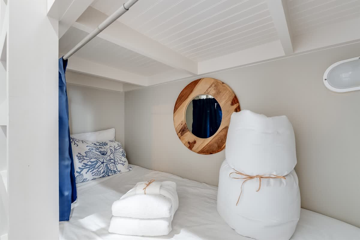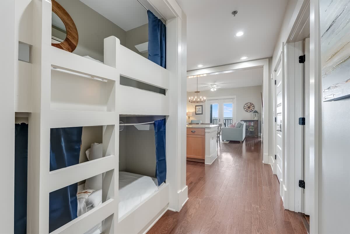The condo accommodates up to eight guests with flexible options for families or groups. Two private suites feature king beds and full baths with shower and tub combinations. In the entryway, a custom bunk bed adds a fun and practical sleeping space. A full pullout sofa offers extra room for additional guests, ensuring everyone has a comfortable place to rest. A half-bath is also available for added convenience.