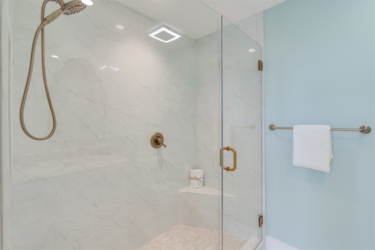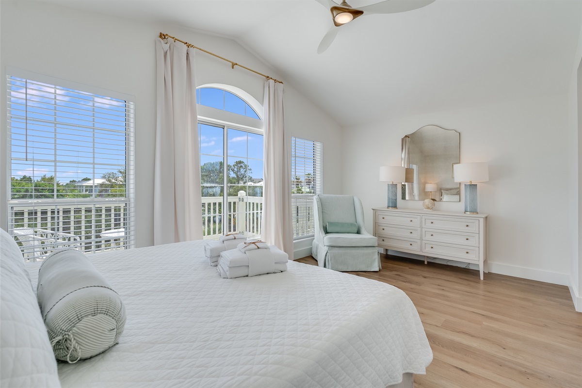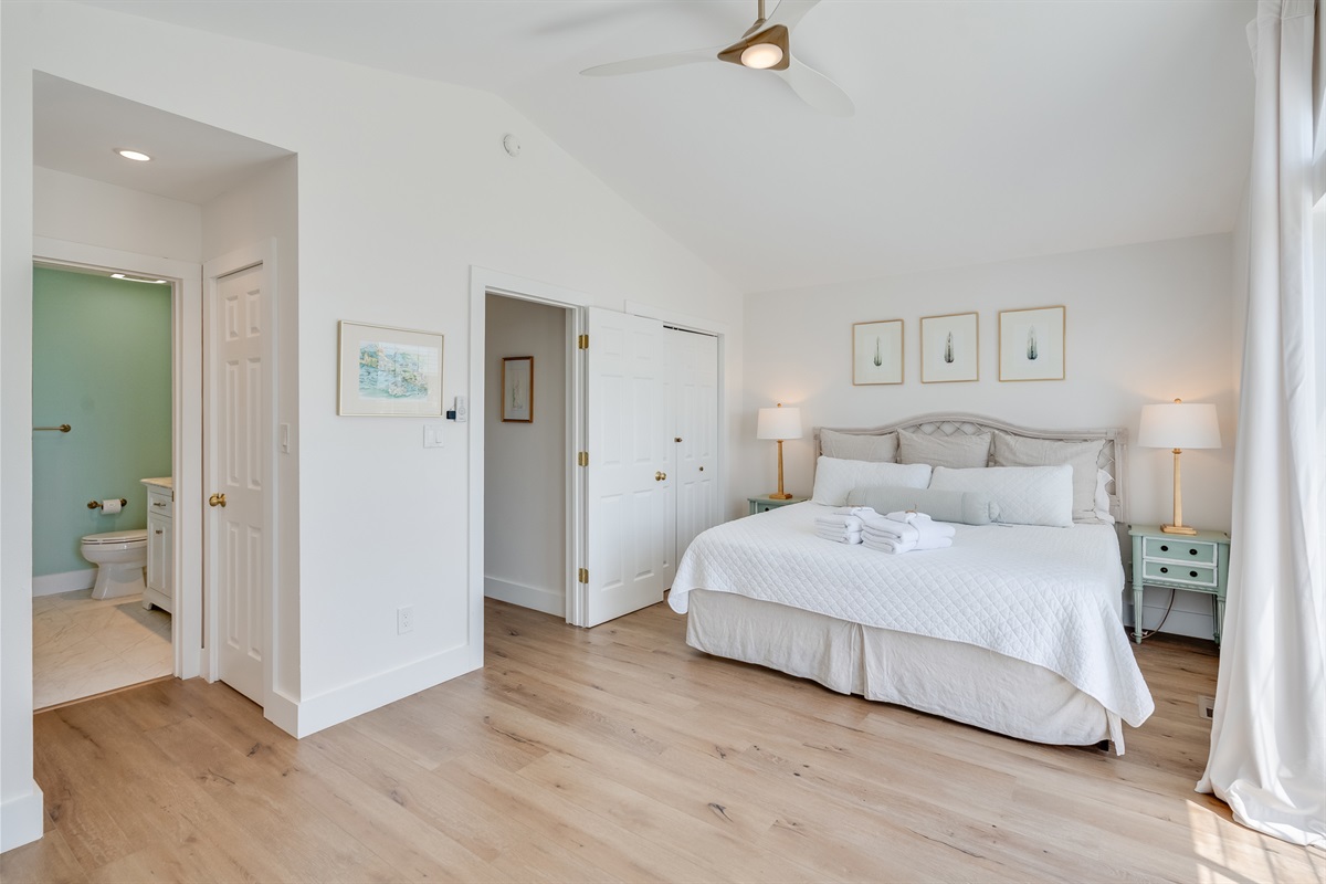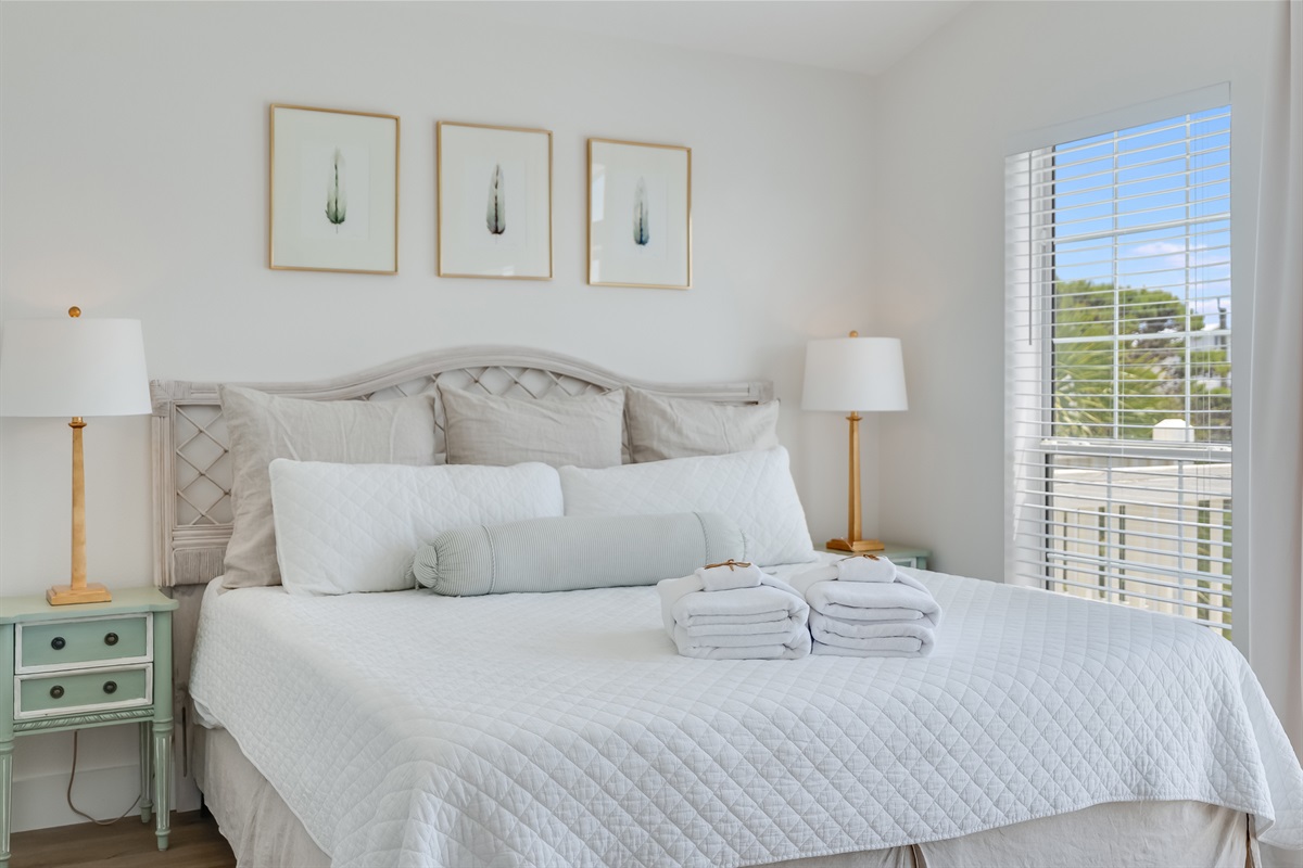 • Bedroom 1 (Top Floor) – King Bed – Private ensuite bathroom with walk-in shower – Private Balcony