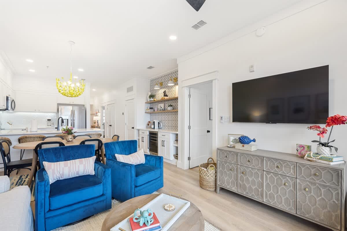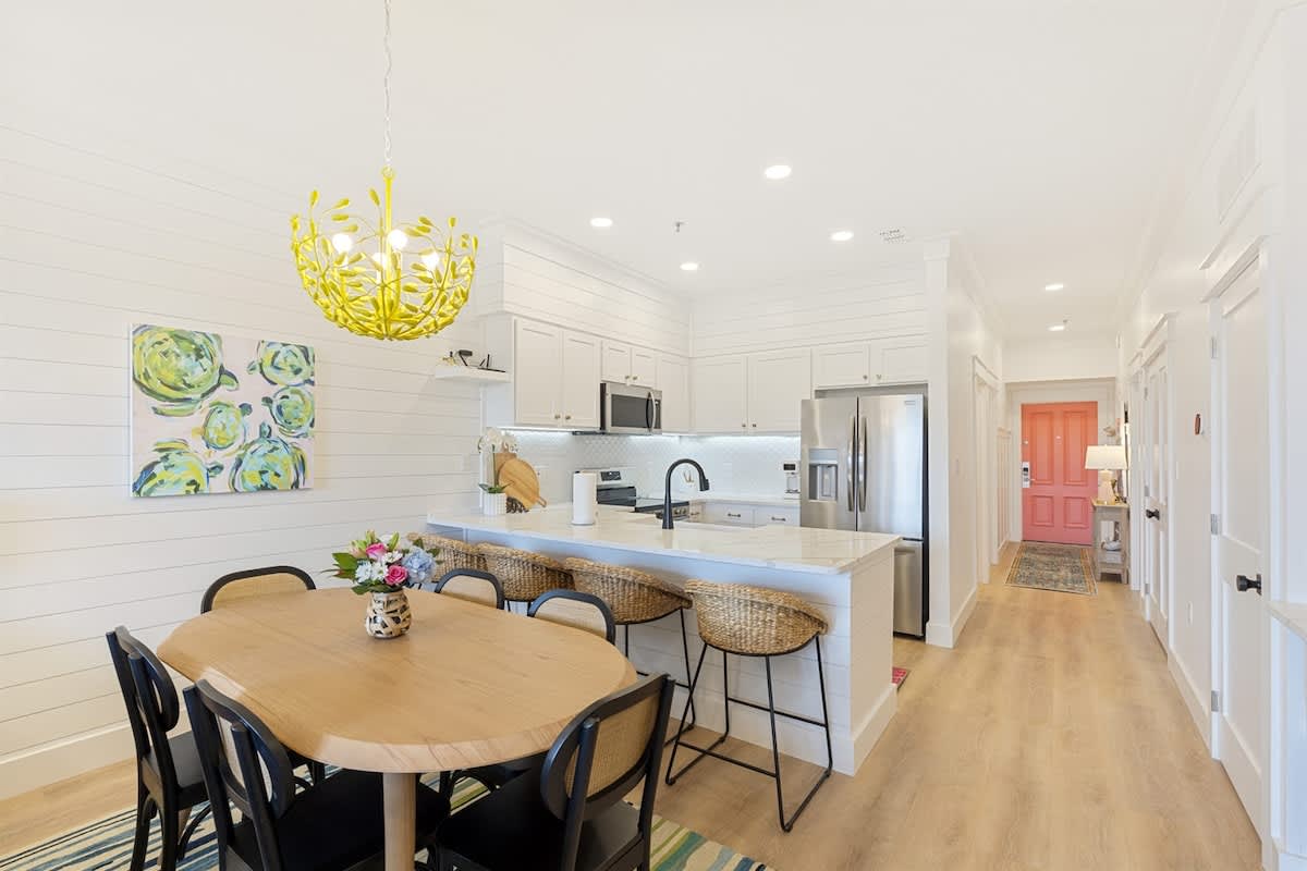Recently renovated, the full kitchen is equipped with stainless steel appliances, a coffee maker, blender, and all the cooking basics you’ll need to prepare meals together. Whether you gather for breakfast before a day at the beach or cook a casual dinner after exploring 30A, the open layout makes it easy to share time while cooking, dining, and relaxing. A washer and dryer are also provided for convenience during longer stays.