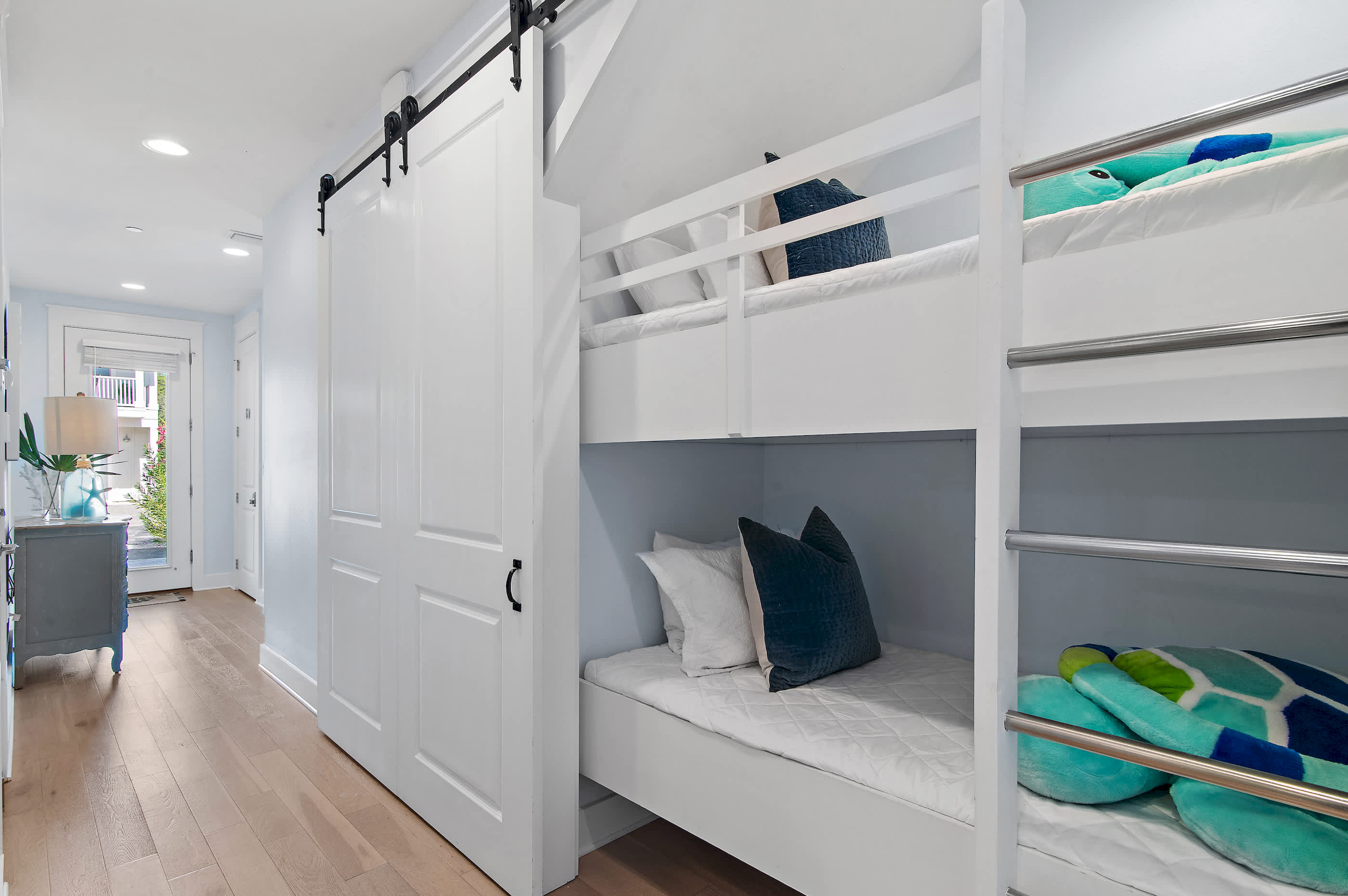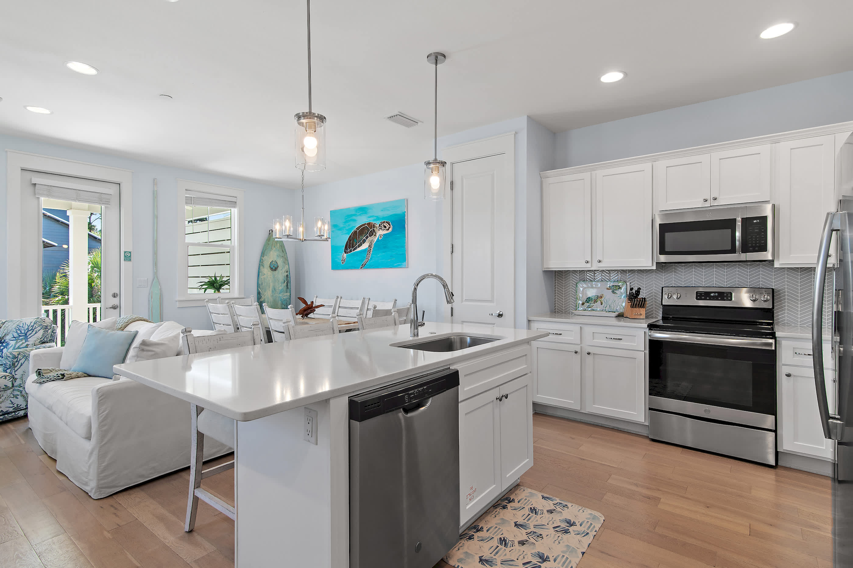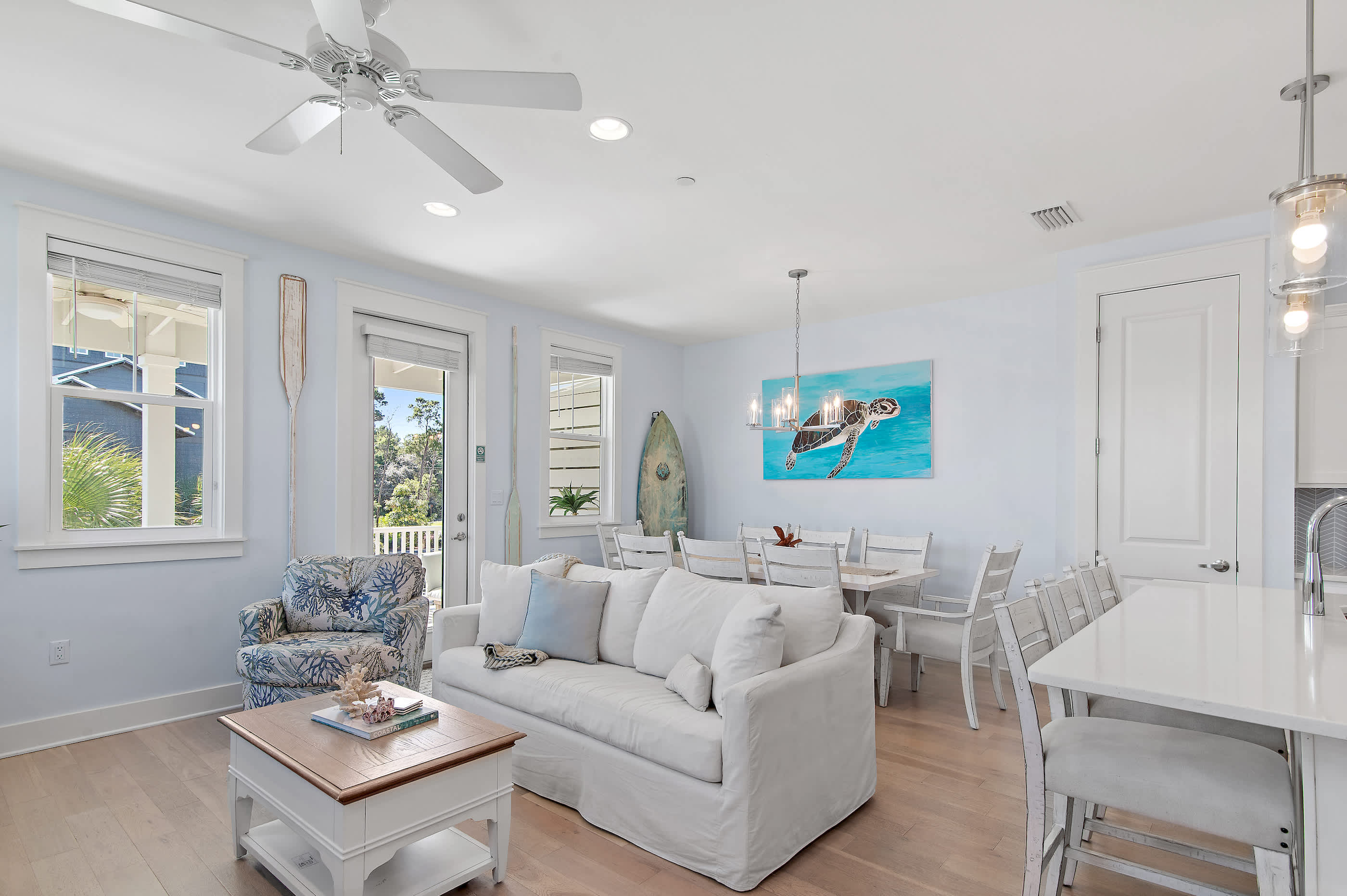 The Sea Turtle House is a study in craftsmanship, featuring designer lighting, crown molding, and gleaming hardwood floors. The open-concept second floor serves as the heart of the home, combining a fully equipped gourmet kitchen with a spacious living and dining area—ideal for making memories with loved ones. With three covered porches, a private garage complete with a ping pong table, and a location just steps from the community pool, this home is designed for both indoor comfort and outdoor fun.