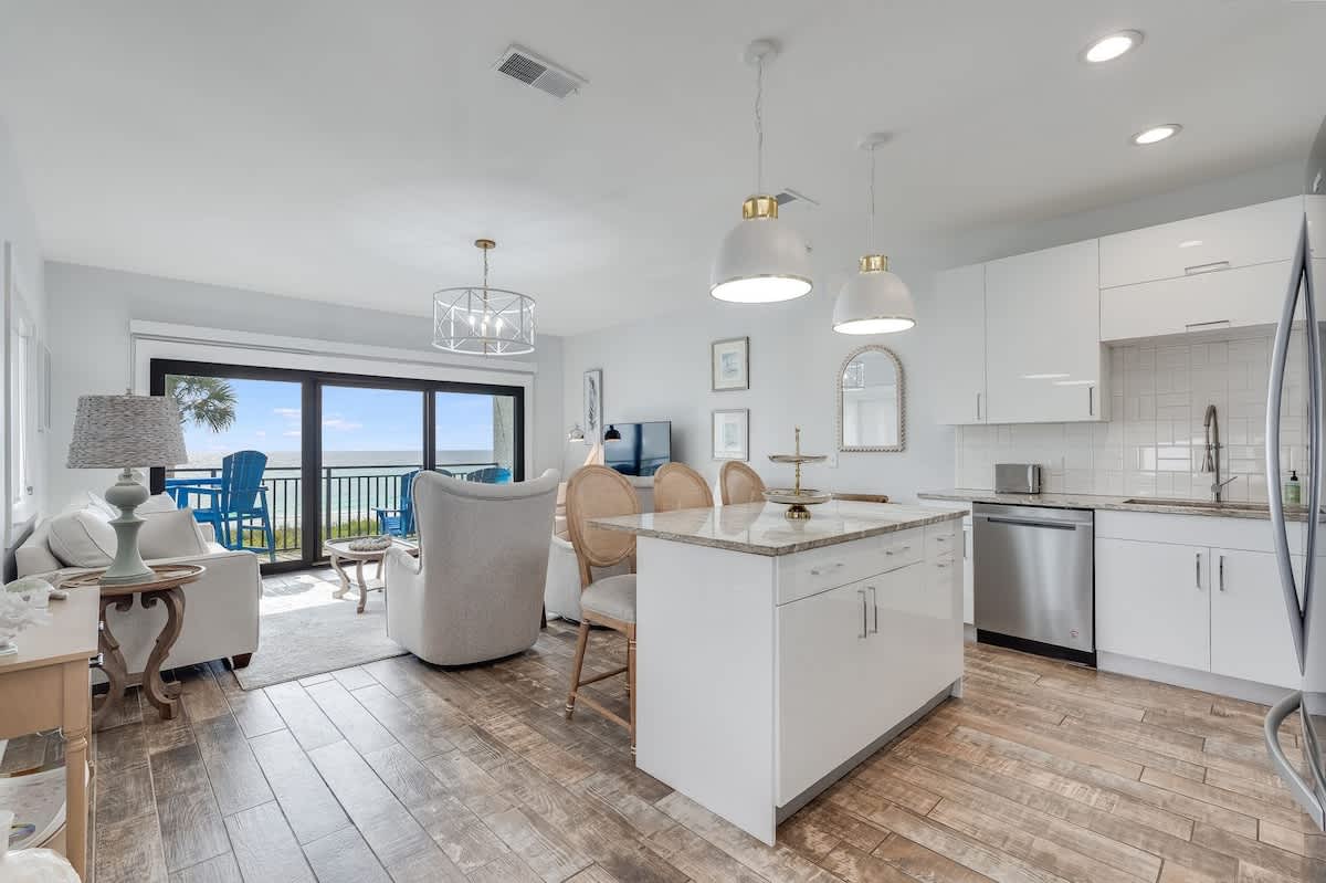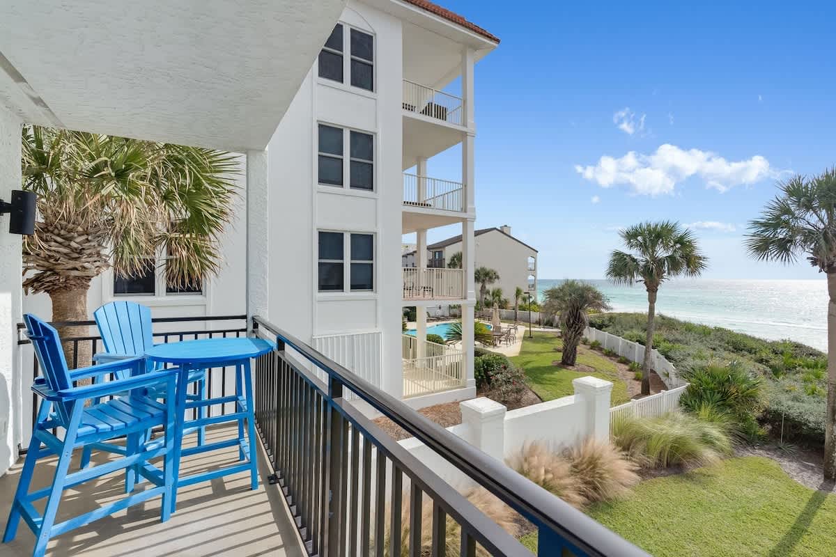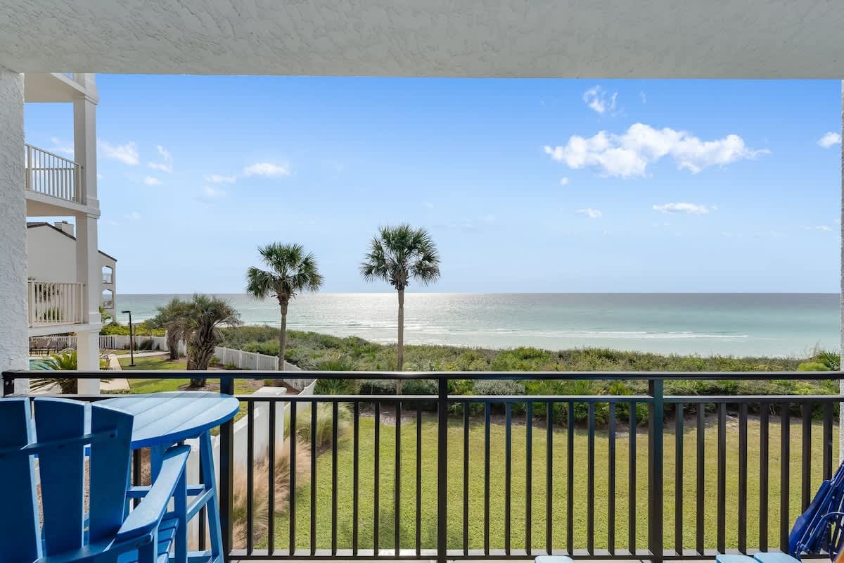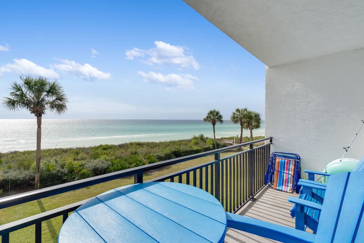 Experience breathtaking Gulf views from The Palms at Seagrove's oceanfront condo. This newly remodeled unit, "Shore to Please," features a master bedroom with ensuite, custom bunks, and two full baths, accommodating up to six guests in an open floor plan with a fully upgraded kitchen, living/dining room, and in-unit washer and dryer.