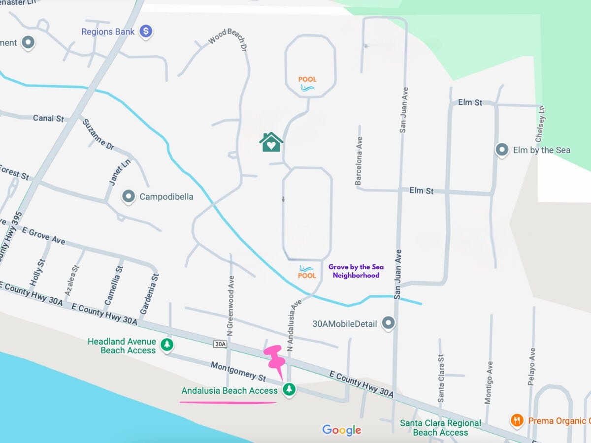 The S. Andalusia Beach access is located directly across 30A from the community entrance. This prime stretch of public beach gives renters plenty of room to enjoy the Gulf Coast!